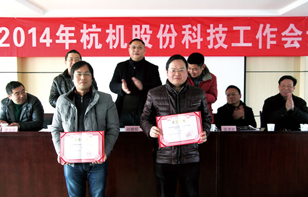 杭機(jī)股份2014年科技工作會(huì)議暨公司首屆科技節(jié)于2月14日舉行。此次2013年度科技創(chuàng)新成果進(jìn)行了表彰,共表彰了科技創(chuàng)新獎(jiǎng)12項(xiàng)和節(jié)約獎(jiǎng)17項(xiàng)。科技創(chuàng)新獎(jiǎng)包括新產(chǎn)品開(kāi)發(fā)獎(jiǎng)6項(xiàng)、工藝技術(shù)創(chuàng)新獎(jiǎng)2項(xiàng)和申請(qǐng)專(zhuān)利獎(jiǎng)4項(xiàng)。公司高層為獲獎(jiǎng)?wù)叽眍C發(fā)了榮譽(yù)證書(shū)。