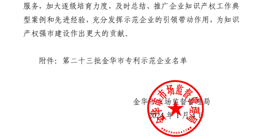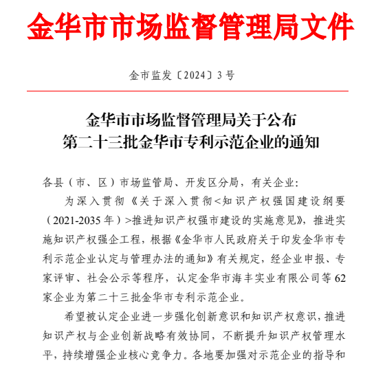 近日,經(jīng)金華市市政府批準(zhǔn),金華市市場監(jiān)督管理局公布了2023年金華市專利示范企業(yè)認(rèn)定結(jié)果,綜合考量企業(yè)知識產(chǎn)權(quán)創(chuàng)造質(zhì)量、運用效益、保護效果和管理效能,我司 “浙江杭機股份有限公司”入選金華市專利示范企業(yè)。