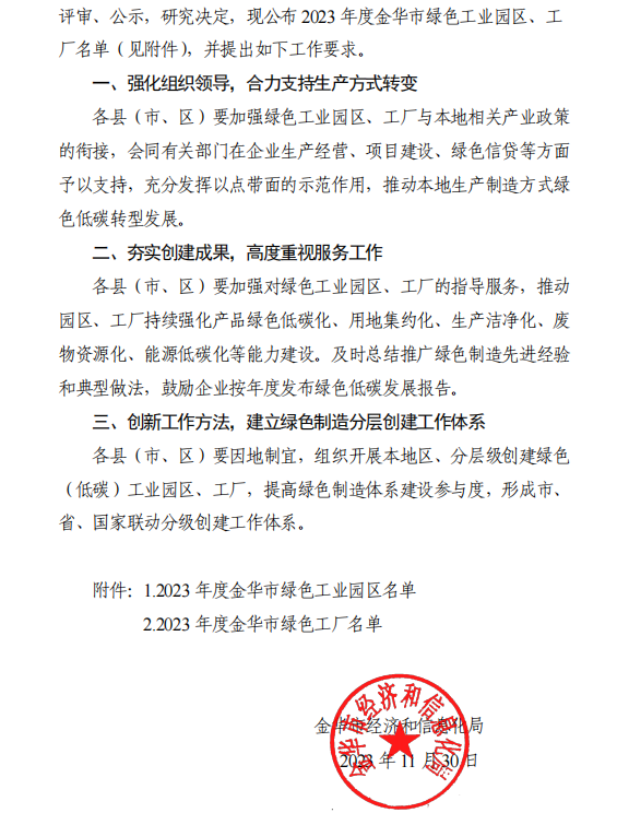 近日,為更好助力金華市工業(yè)領(lǐng)域“雙碳”工作,開(kāi)展美麗金華建設(shè)、“無(wú)廢城市”創(chuàng)建等工作。金華市經(jīng)濟(jì)和信息化局開(kāi)展“2023 年度金華市綠色工業(yè)園區(qū)、工廠”申報(bào)工作。我司 “浙江杭機(jī)股份有限公司”獲評(píng)“2023 年度金華市綠色工廠”。